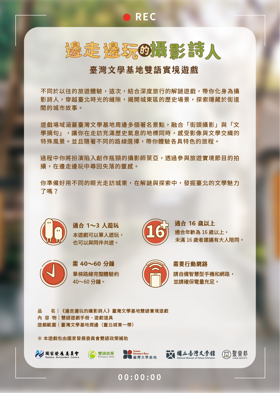 二、預約參加英語導覽者,可獲贈「臺灣文學基地雙語實境遊戲包」。遊戲包內含解謎遊戲手冊,旨在引導使用者探索城東地區文化資產,並透過雙語內容融合英語與華語學習元素。