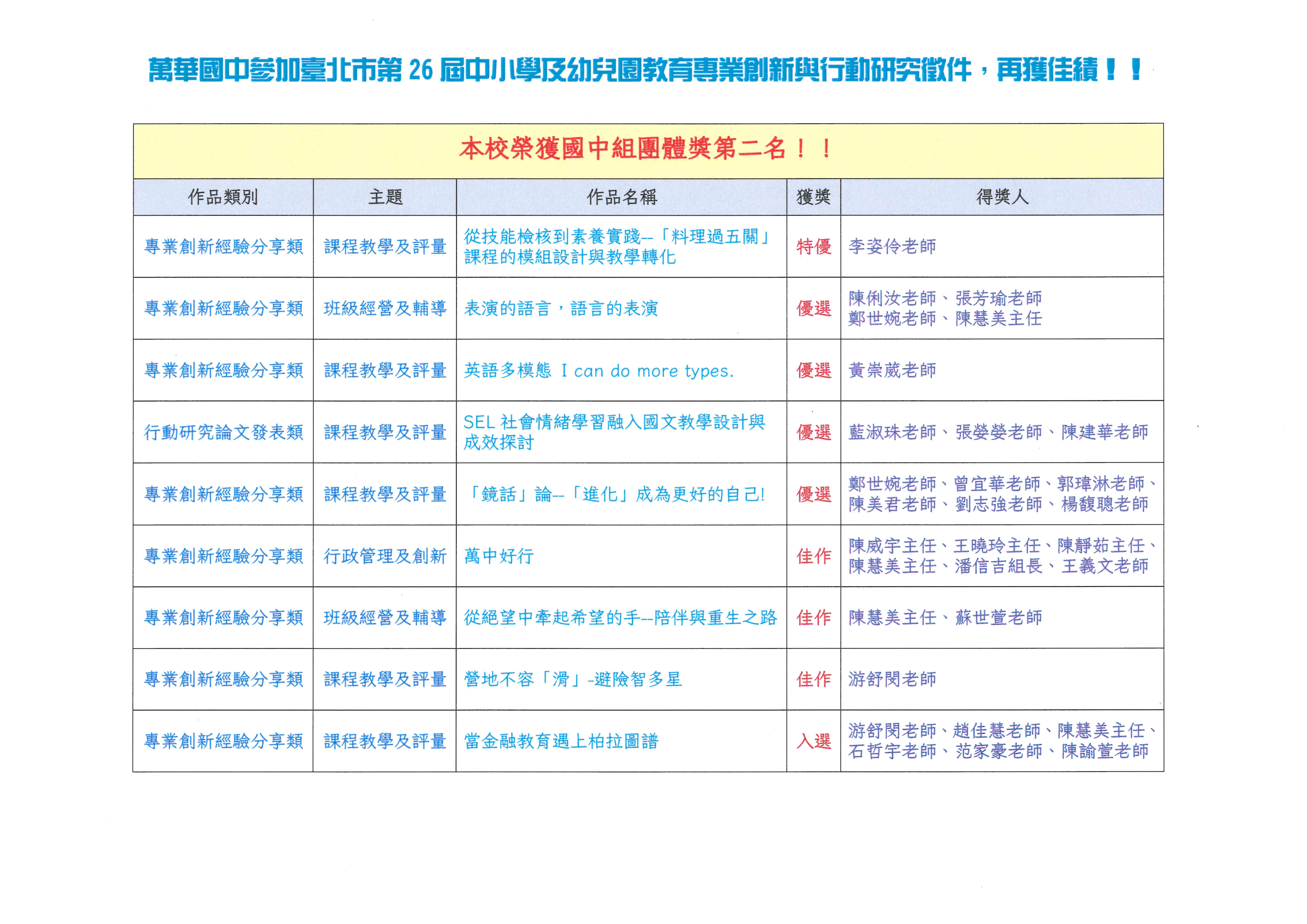 本校教師參加臺北市第26屆中小學及幼兒園教育專業創新與行動研究徵件,共有9件獲獎