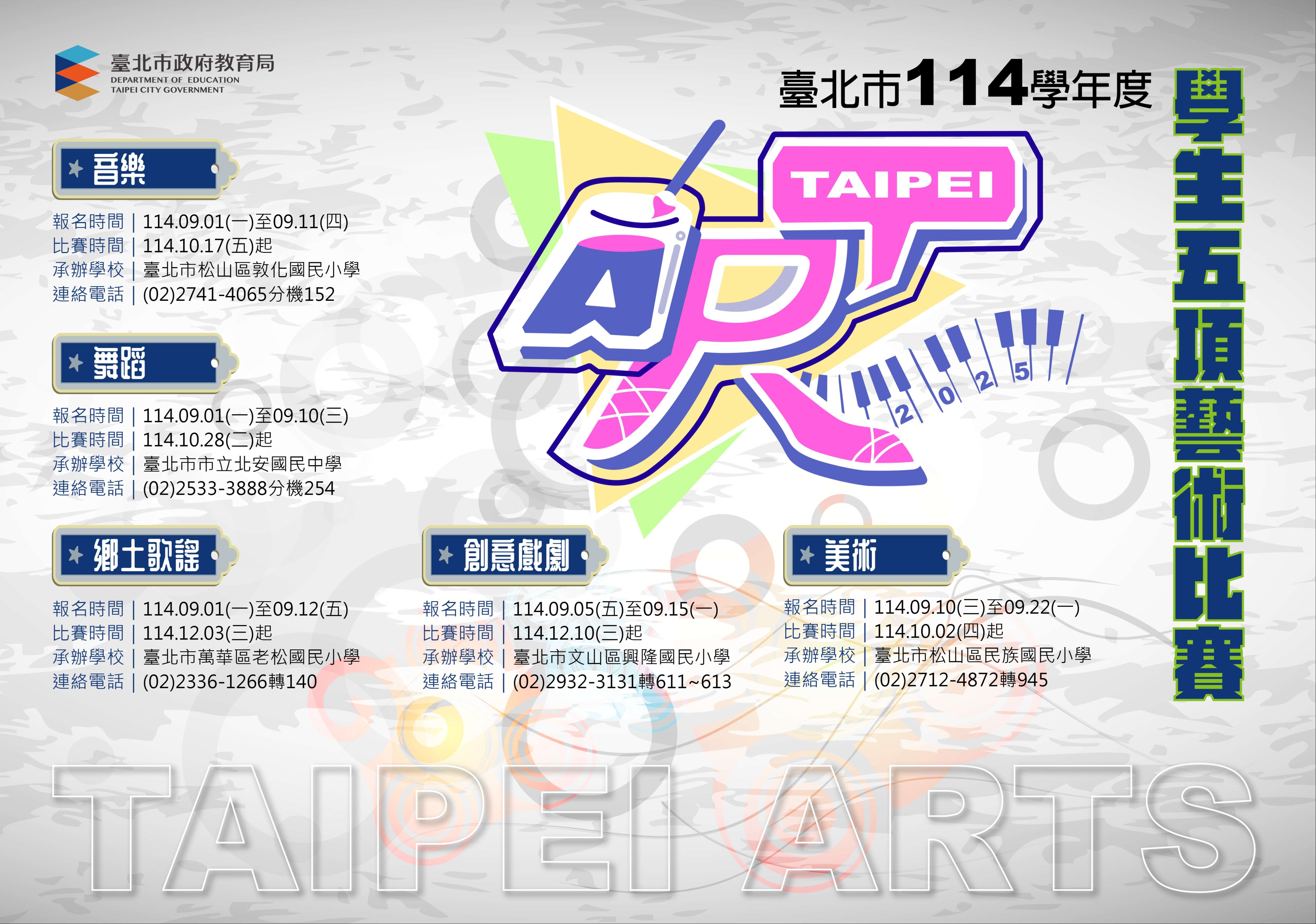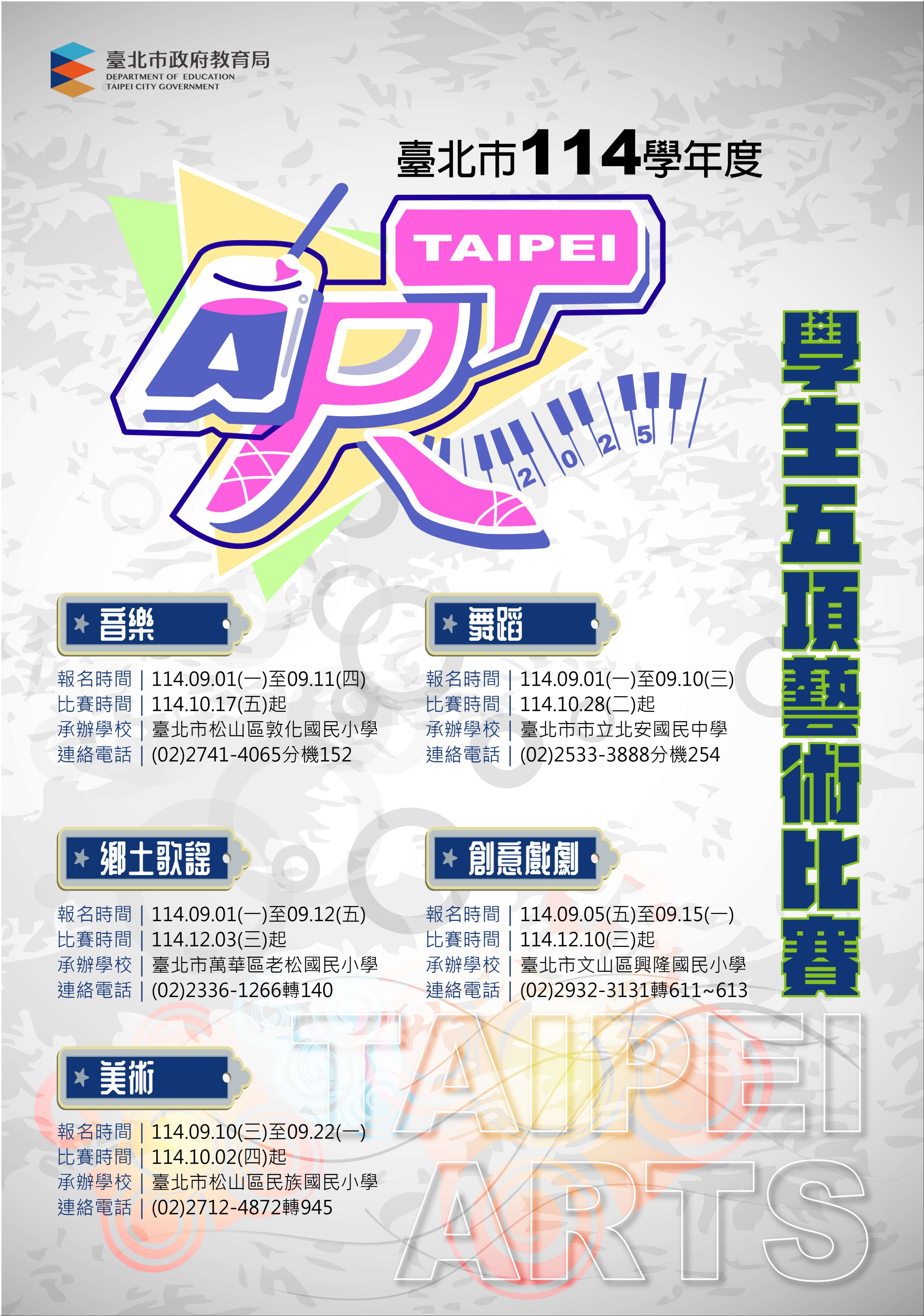 臺北市114學年度學生五項藝術比賽(音樂、美 術、舞蹈、創意戲劇及鄉土歌謠)自9/1起陸續報名
