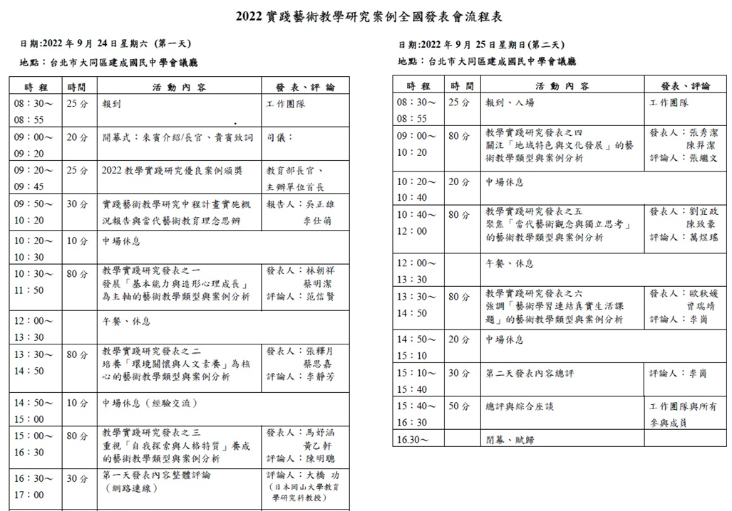 (二)發表方式由本計畫資深成員分析計劃理念與目標,歸納 當代視覺藝術教育的不同教學型態,以歷年教學實踐研 究的代表性案例進行對照提出報告,並邀請計畫諮詢委員擔任評論人對發表內容提出分析意見,再共同對應現 場提問及研討,詳細活動流程與內容請參閱:附件一 《2022全國發表會流程表》