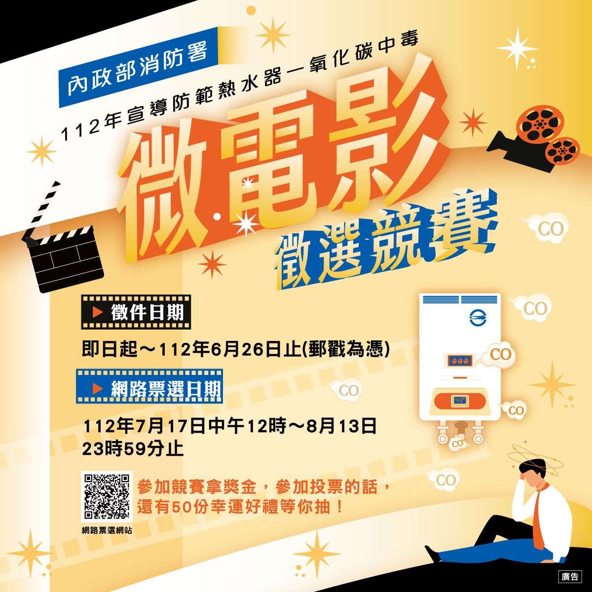 內政部消防署「112年宣導防範熱水器一氧化碳中毒 微電影徵選競賽」網路票選活動,詳細活動內容,請詳附加檔案。