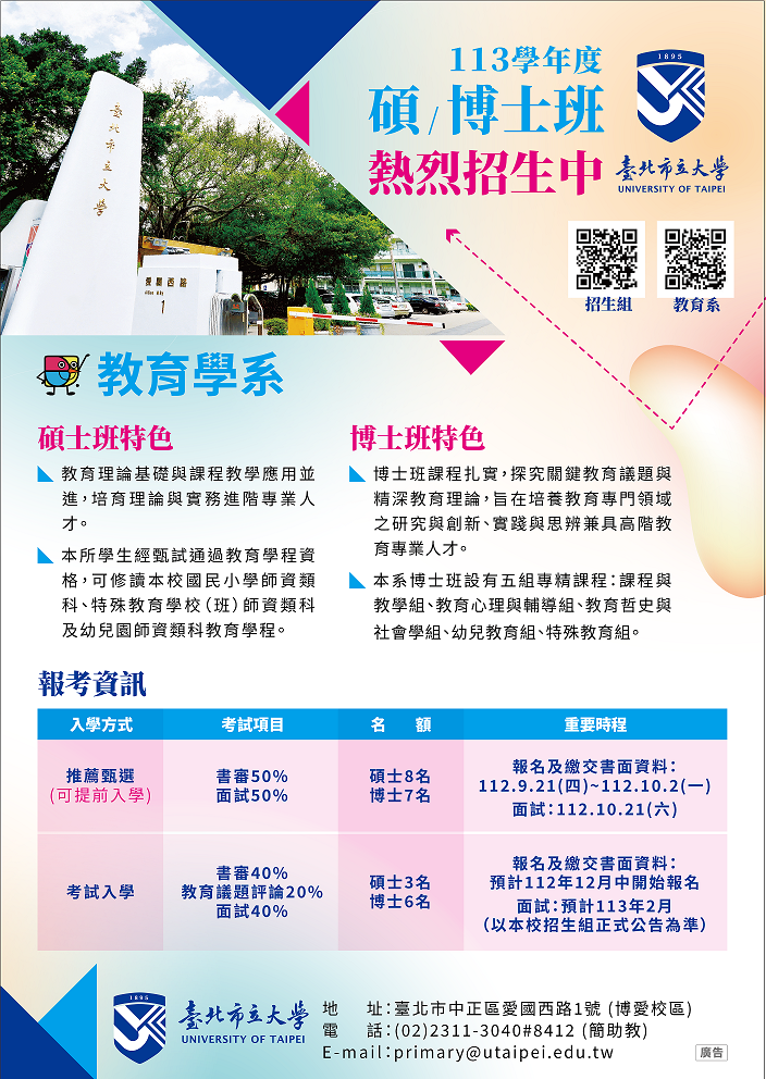 臺北市立大學教育學系「113學年度碩士班暨博士班推薦甄選」招生,碩士班招生8名;博士班設有五組專 精課程:課程與教學組、教育哲史與社會學組、教育心理 與輔導組、幼兒教育組與特殊教育組,合計招生7名。