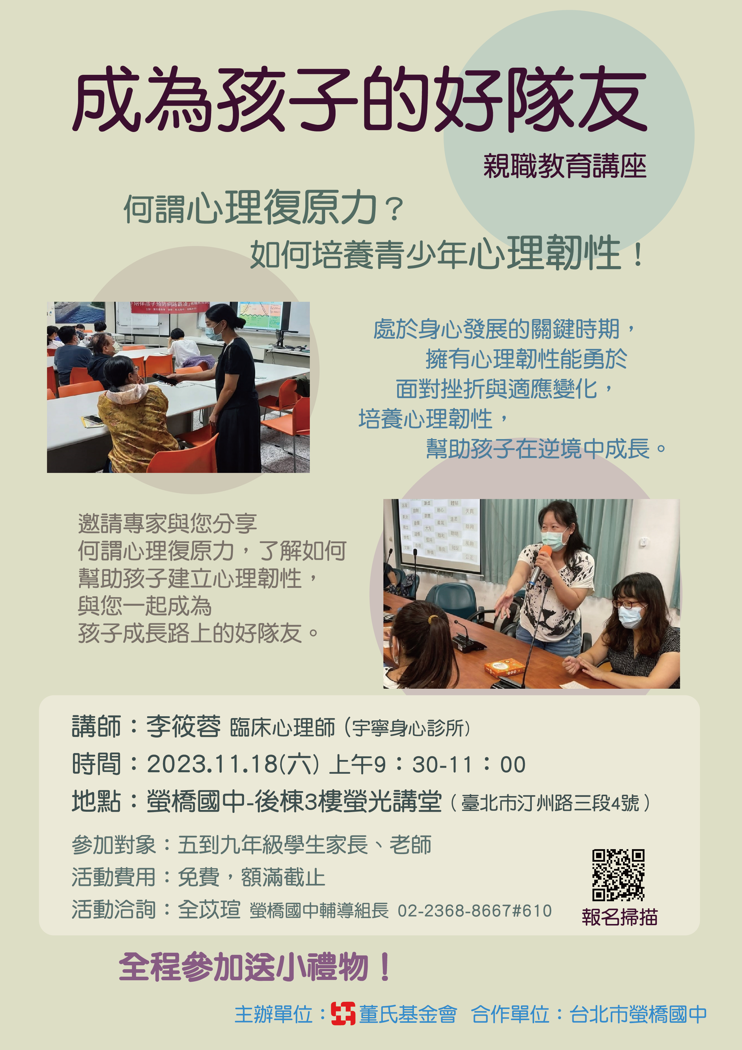 一、講座主題:「成為親子的好隊友」 何謂心理復原力如何 培養青少年心理韌性!