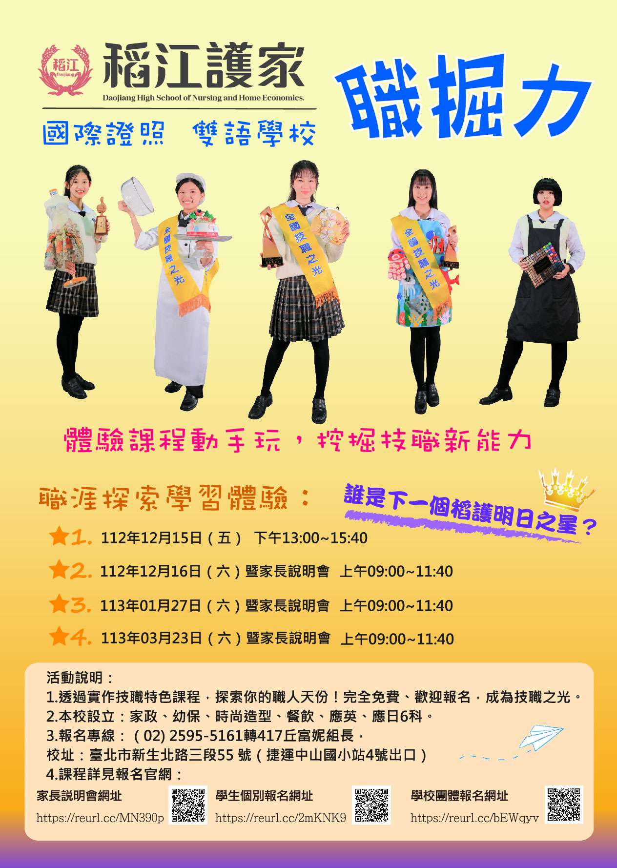 二、本學期於112年12月15日(五)、12月16日(六)、113年1月27 日(六)、113年3月23日(六)辦理「稻江護家職掘力實作體 驗」,誠摯邀請 貴校八、九年級學生參加,並歡迎 貴 校教師或學生家長共同參與。