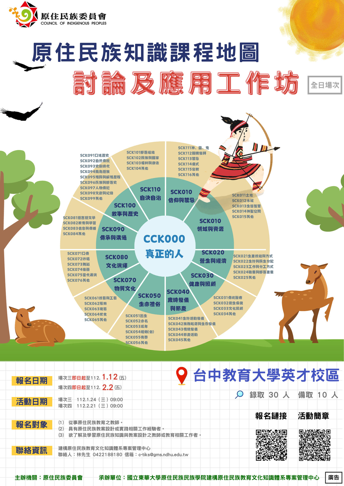 一、國立東華大學於113年1月24日(星期三)、2月21日(星期三)辦理「112年度原住民族知識課程地圖討論及應用工作坊」