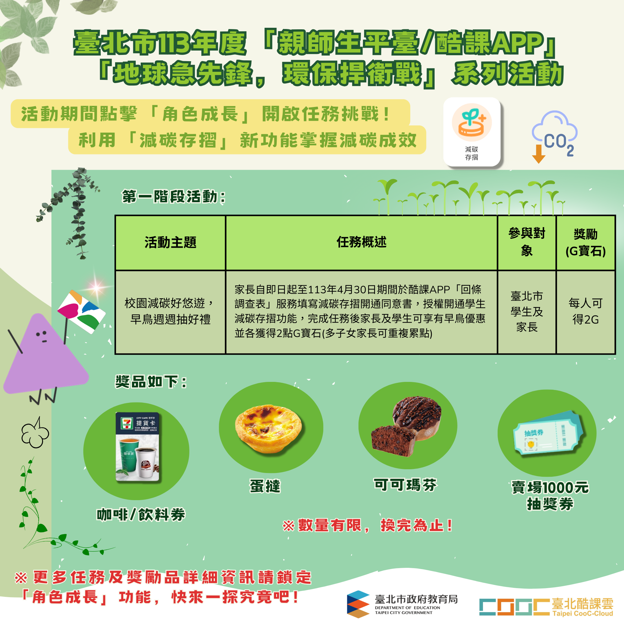 結合酷課APP「角色成長」獎勵制度,推出「地球急先鋒,環保捍衛戰」系列活動計畫(附件1)。