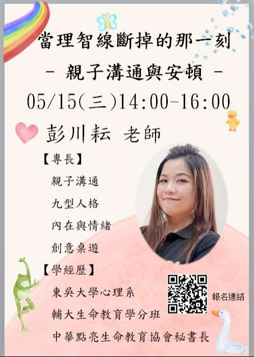 (二) 05/15(三)14:00-16:00,《當理智線斷掉的那一刻 親 子溝通與安頓》彭川耘老師。