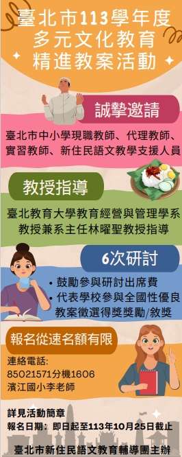 一、 依據臺北市政府教育局113年度推展多元文化教育實施計畫暨臺北市113年度新住民語文教育輔導團年度計畫辦理。