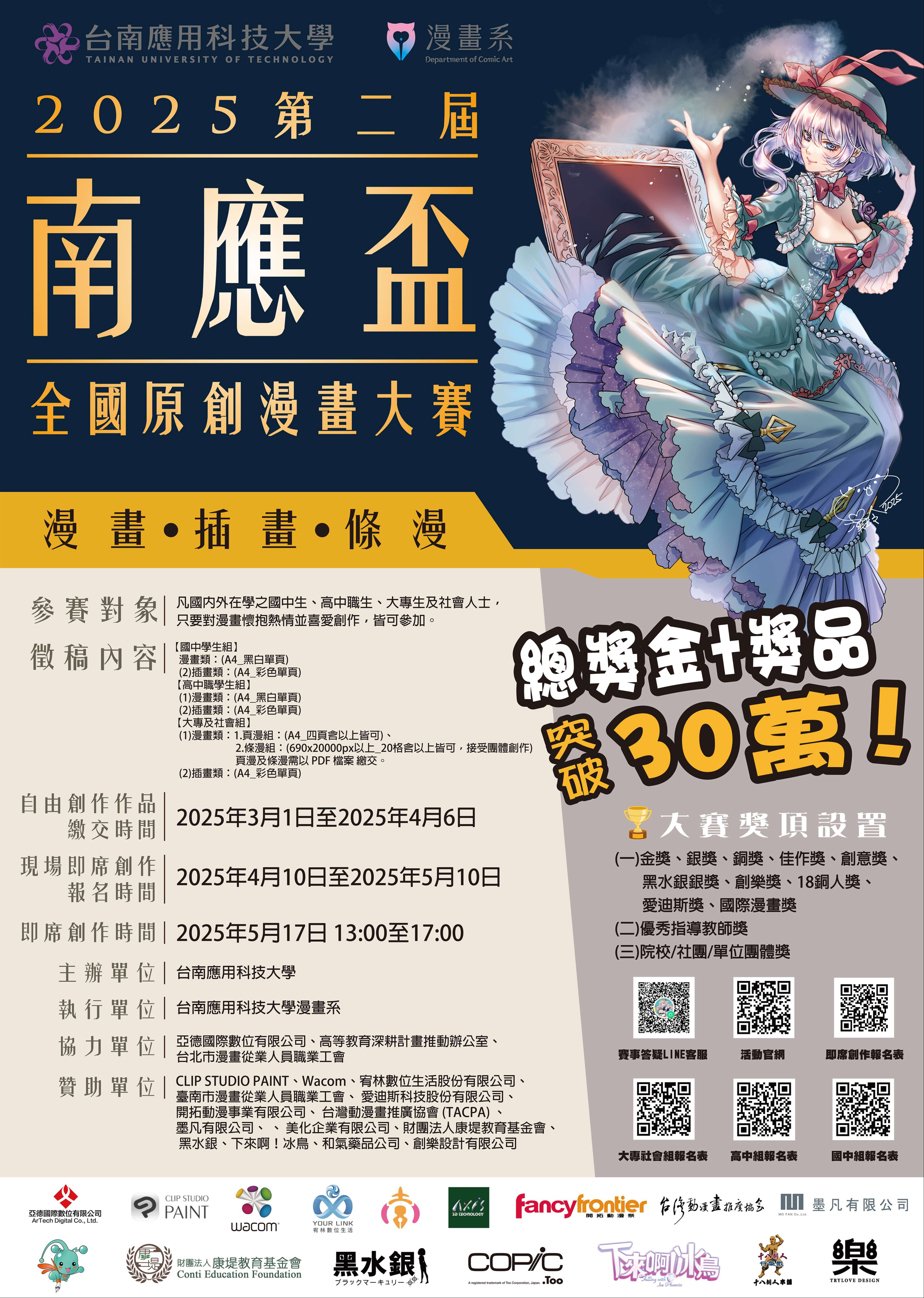 六、聯繫與報名連結方式: (一)聯絡單位:本校漫畫系 (二)聯絡電話:TEL:06-2436522(專線)/06-2532106轉314林 舜青主任 (三)賽事社群:https://reurl.cc/9vzL8V (四)大專社會組自由創作報名連結:https://forms.gle /HhZMx8AGefvWaWfo7 (五)高中組自由創作報名連結:https://forms.gle /zN3SHsq7drvWtyBt6 (六)國中組自由創作報名連結:https://forms.gle /fVpUQMoMa1jLscmz8 (七)即席創作報名連結:https://www.surveycake.com/s /AapDa