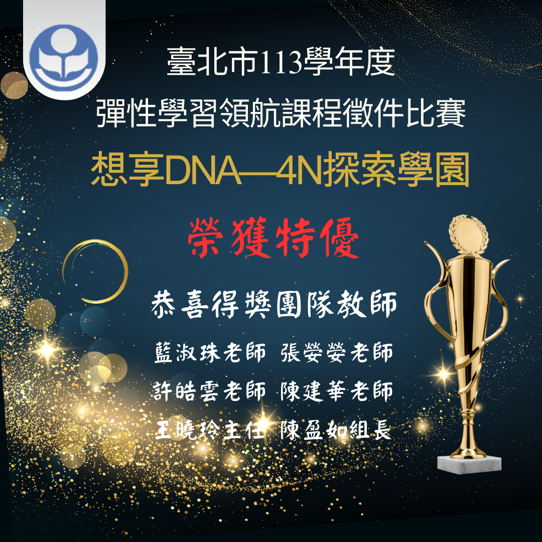 🏆藍淑珠老師、張嫈嫈老師、許皓雲老師、陳建華老師、王曉玲主任、陳盈如組長以「想享DNA—4N 探索學園」獲得特優殊榮