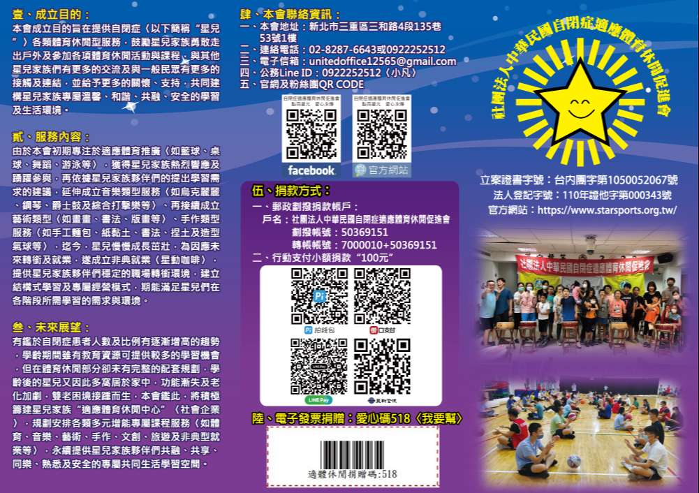 二、本會長期致力於自閉症者〈以下簡稱“星兒”〉各項體育 〈籃球、桌球、水適能、舞蹈等〉及休閒〈藝術創作、音 樂培養、手作工藝等〉等服務,期能提供星兒家庭專屬合 適的學習環境,不斷成長〈簡介單張如附件一〉。