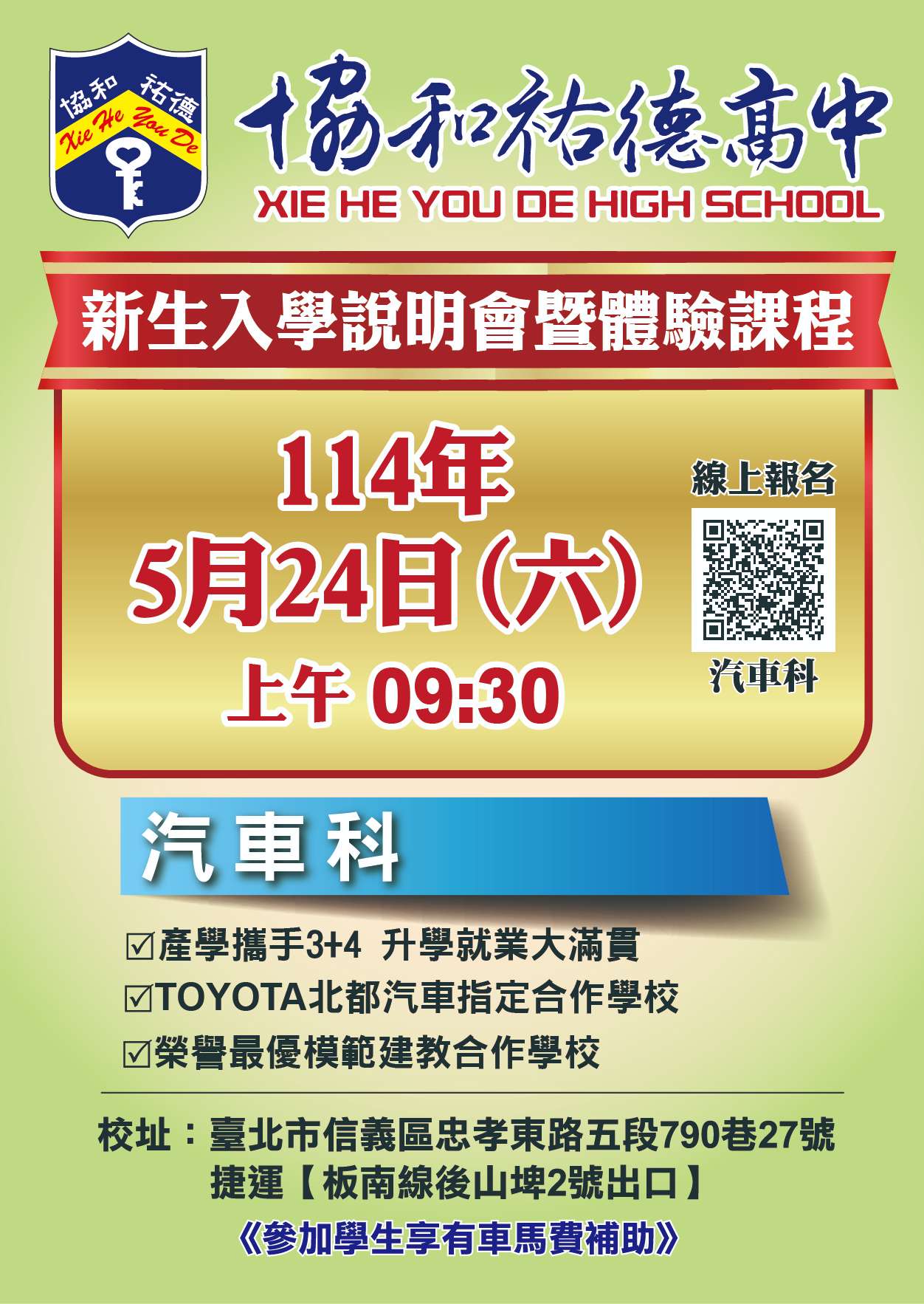 一、本校舉辦說明會的目的就是要呈現本校技職優質的辦學績 效,讓國中學生及家長在面臨升學選擇時,對於本校的汽 車科特色、入學方式、獎助學金、交通,以及未來進路等 升學資訊有更詳盡的認識。