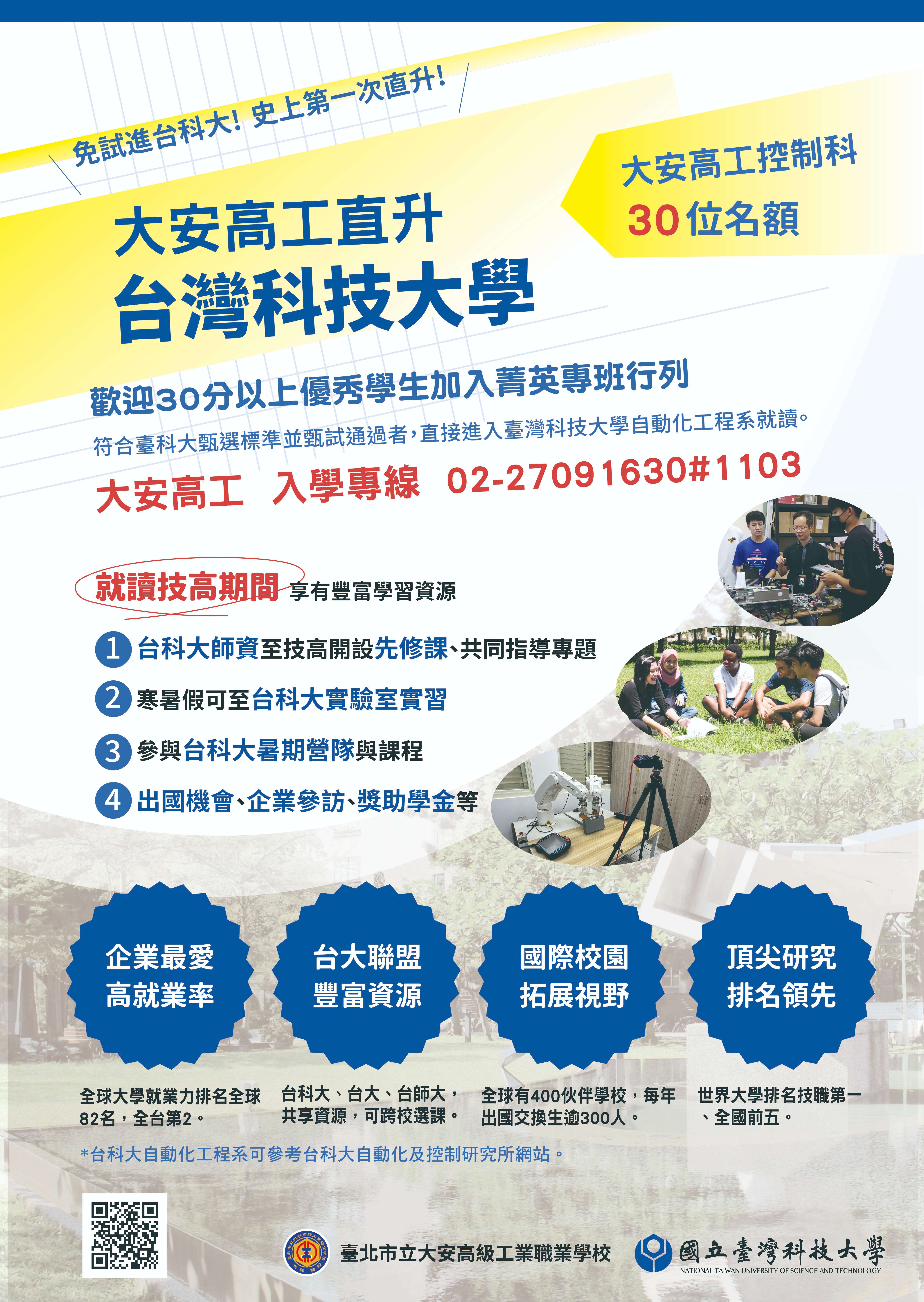 二、本市大安高工與國立臺灣科技大學合作3+2新五專模式「直 升臺科大專班」,為具實作潛力學生打造直升國立科技大 學的入學管道,鼓勵學生投入技職領域學習專業技術與實 作。