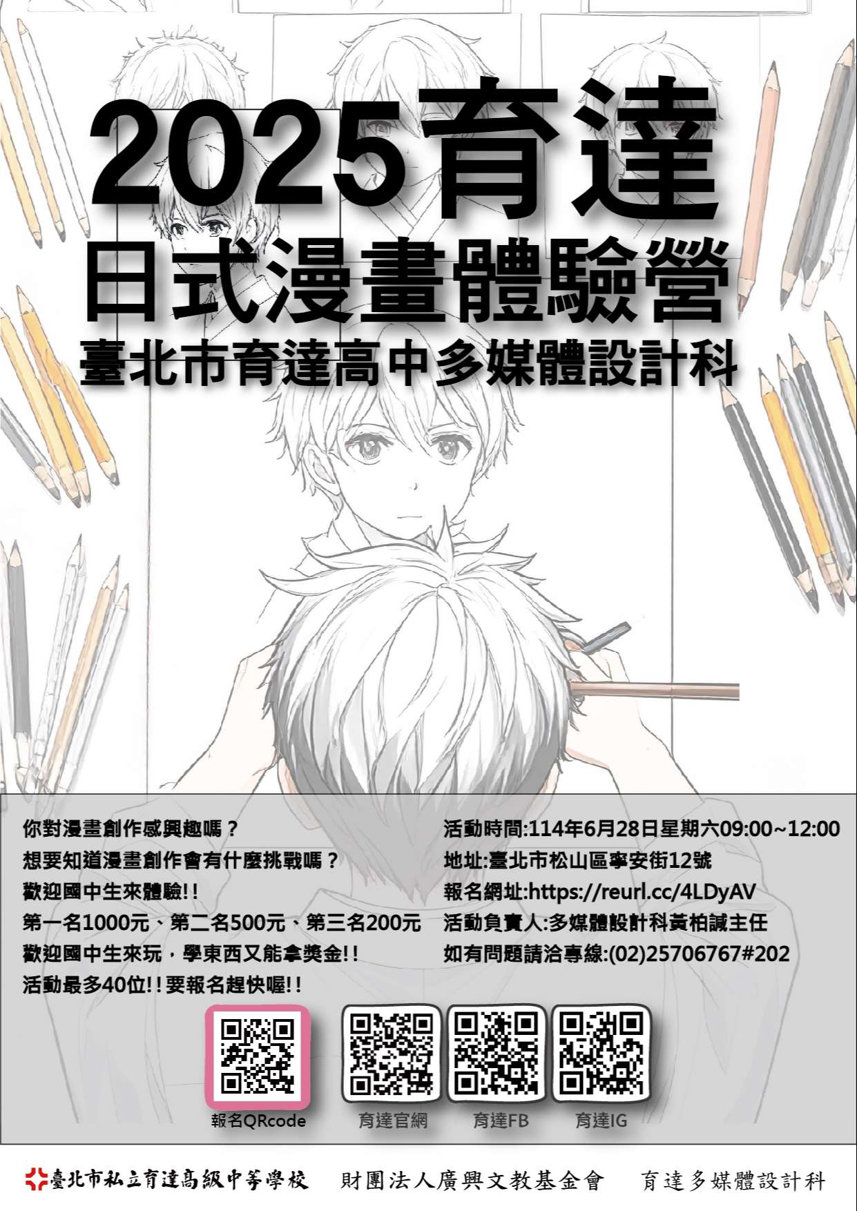 三、活動訊息: (一)活動費用:全部免費(國中生) (二)活動時間:2025年6月28日星期六 09:00~12:00 (三)辦理地點:臺北市育達高中(臺北市松山區寧安街12號)