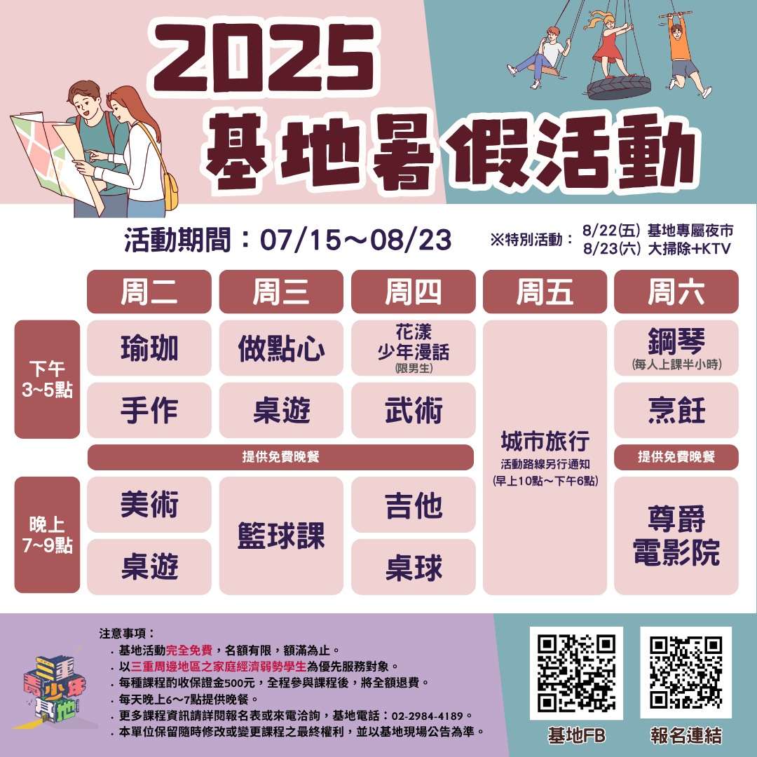 一、三重青少年基地於2025年7/15~8/23(每周二~周六)舉辦暑 假活動,活動課程表如附件一。