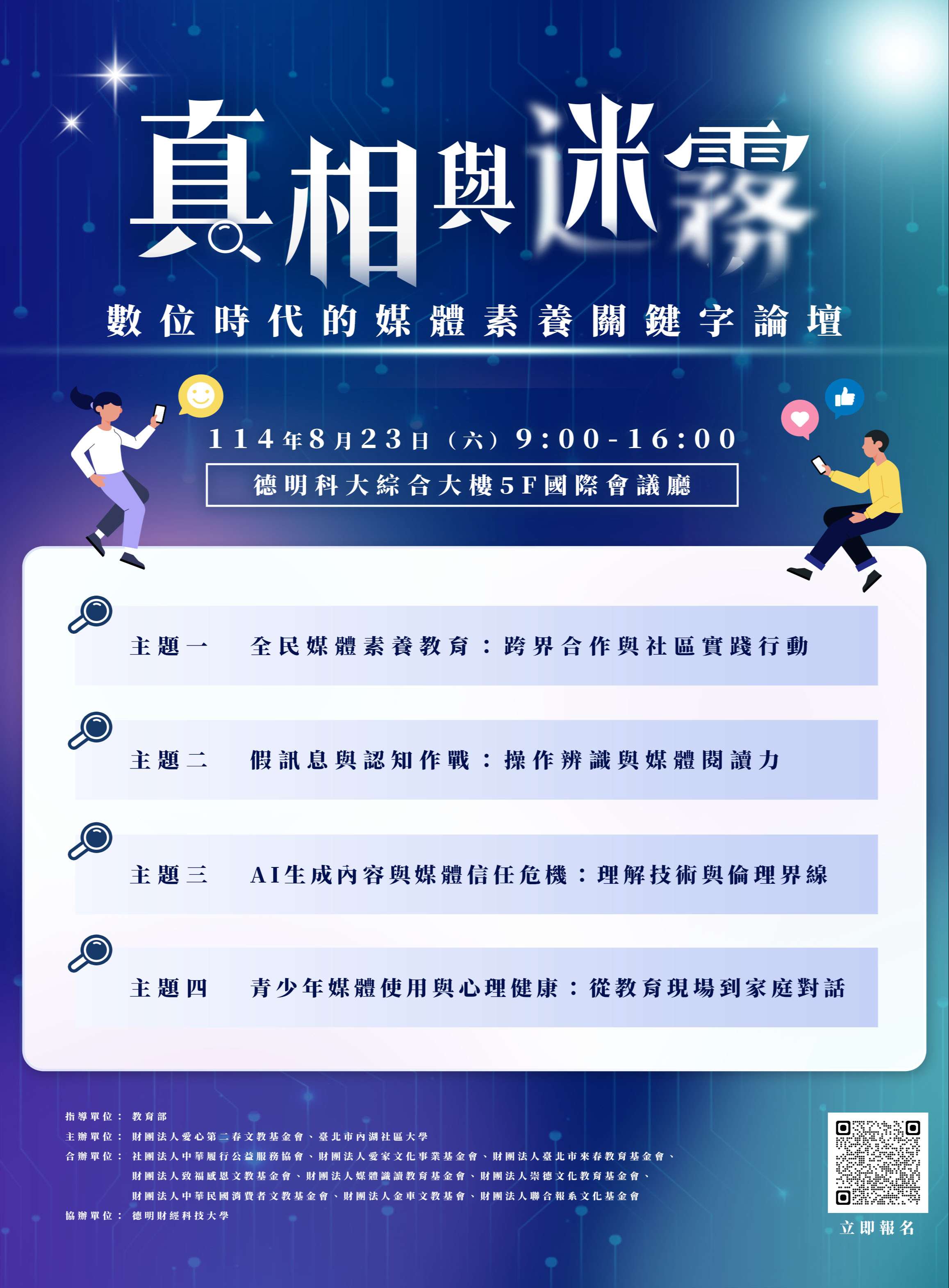 一、本論壇旨在凝聚教育、科技、心理與公民社會的力量,透過多元觀點對話,探索媒體素養在大眾認知、AI內容、青少年發展與社區行動中的關鍵角色。期望喚起全民關注媒體環境變遷,共建健康、理性的資訊社會。