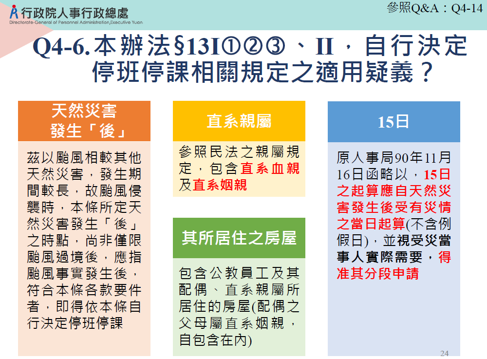 二、因應本次樺加沙颱風外圍環流帶來豪大雨,造成花東地區重大災損,為利本府公教員工實際照護需求以加速災後重建,公教員工其配偶或直系親屬如有前開規定所定情事,請各機關(構)學校依規定本於權責從寬認定給予所屬公教員工停止上班登記。