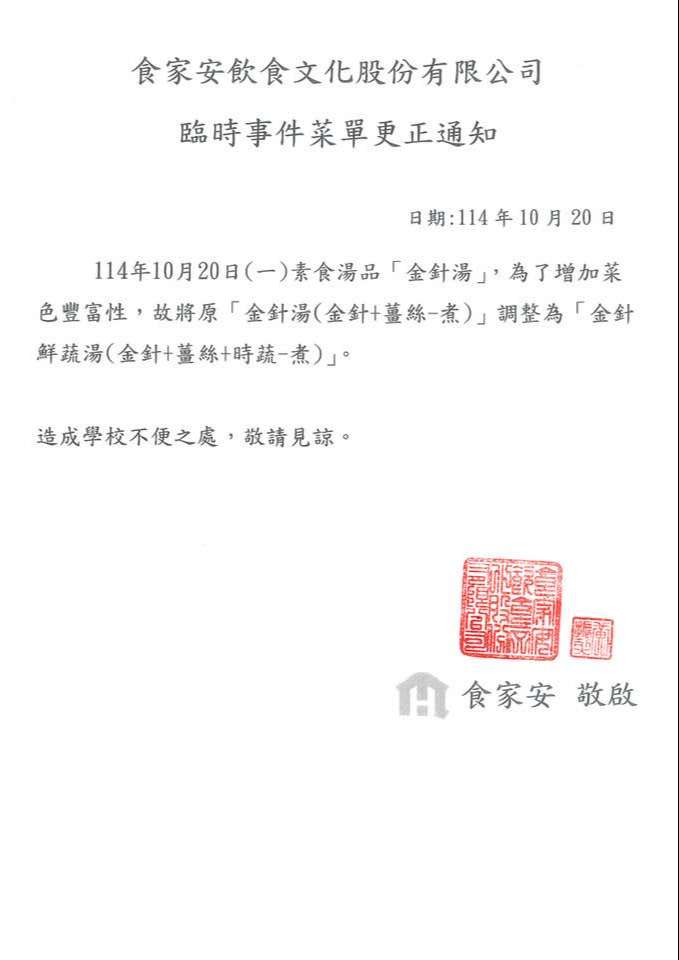 10/20(一)素食湯品,為增添菜色,原「金針湯(金針+薑絲-煮)」調整為「金針鮮蔬湯(金針+薑絲+時蔬-煮)」