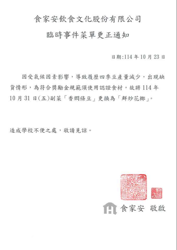 10/31(三)副菜,受氣候因素影響,原「香燜條豆」更改為「鮮炒花椰」