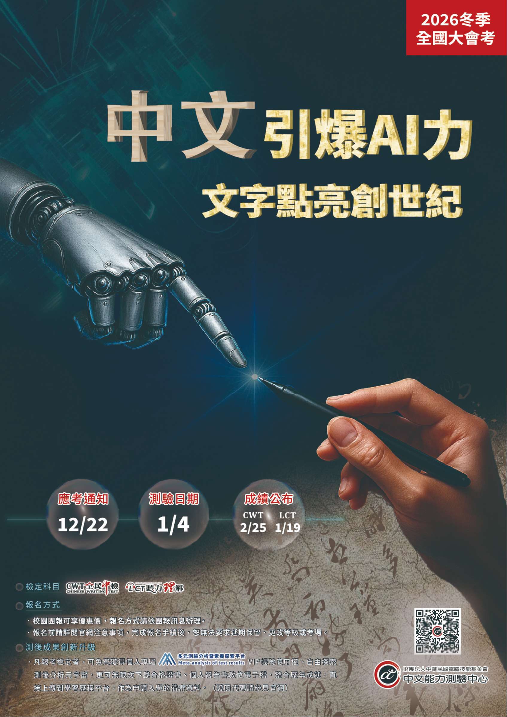 主旨:「2026中文能力測驗中心冬季全國大會考」將於2026年1月4日舉辦,敬請貴校鼓勵學生踴躍參加,請查照。