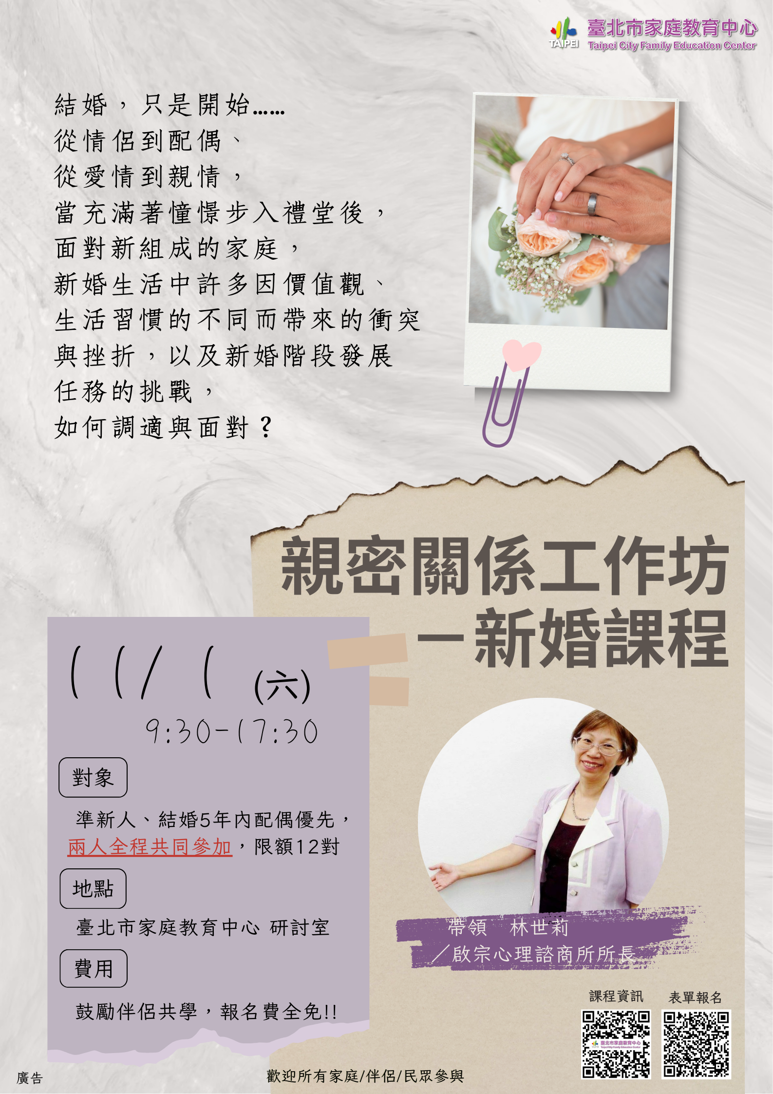 歡迎參加臺北市家庭教育中心11月1日舉辦之「親 密關係工作坊-新婚課程」,幫助家庭新鮮人迎接婚姻 生活挑戰,學習欣賞包容,順利並持續經營關係!報名 請官網查詢。