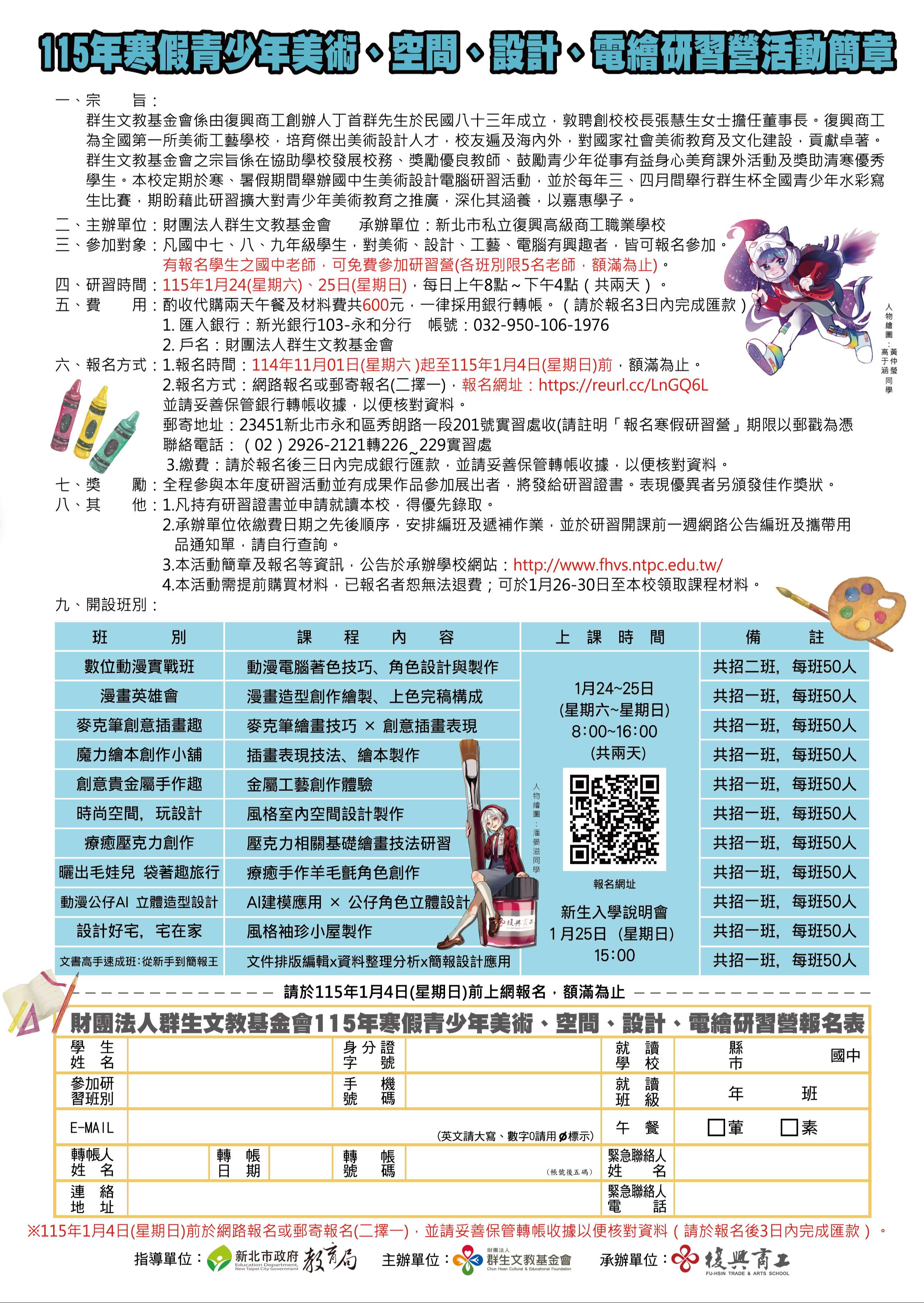 七、報名時間:114年11月01日(星期六)起至115年1月04日(星 期日)前,額滿為止。任何課程相關問題,聯絡電話(02) 2926-2121轉226~229。