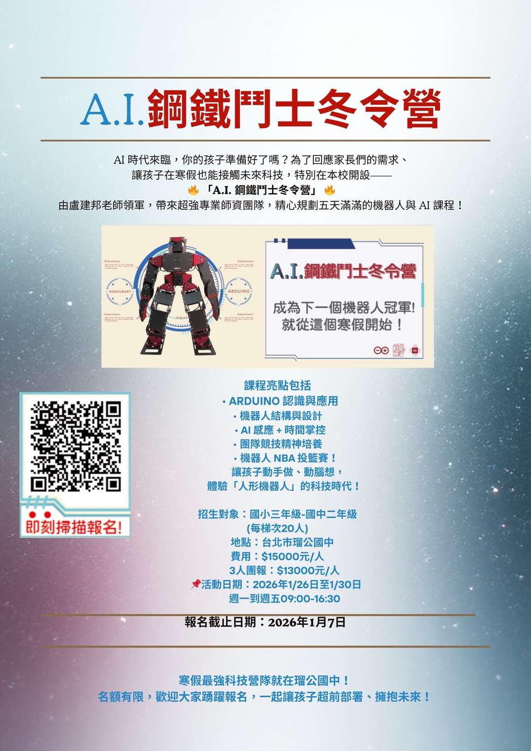 一、本校與瑠公國中家長會、威運科技、機盛科技辦理「AI鋼鐵鬥士冬令營」,詳細課程資訊如附件。
