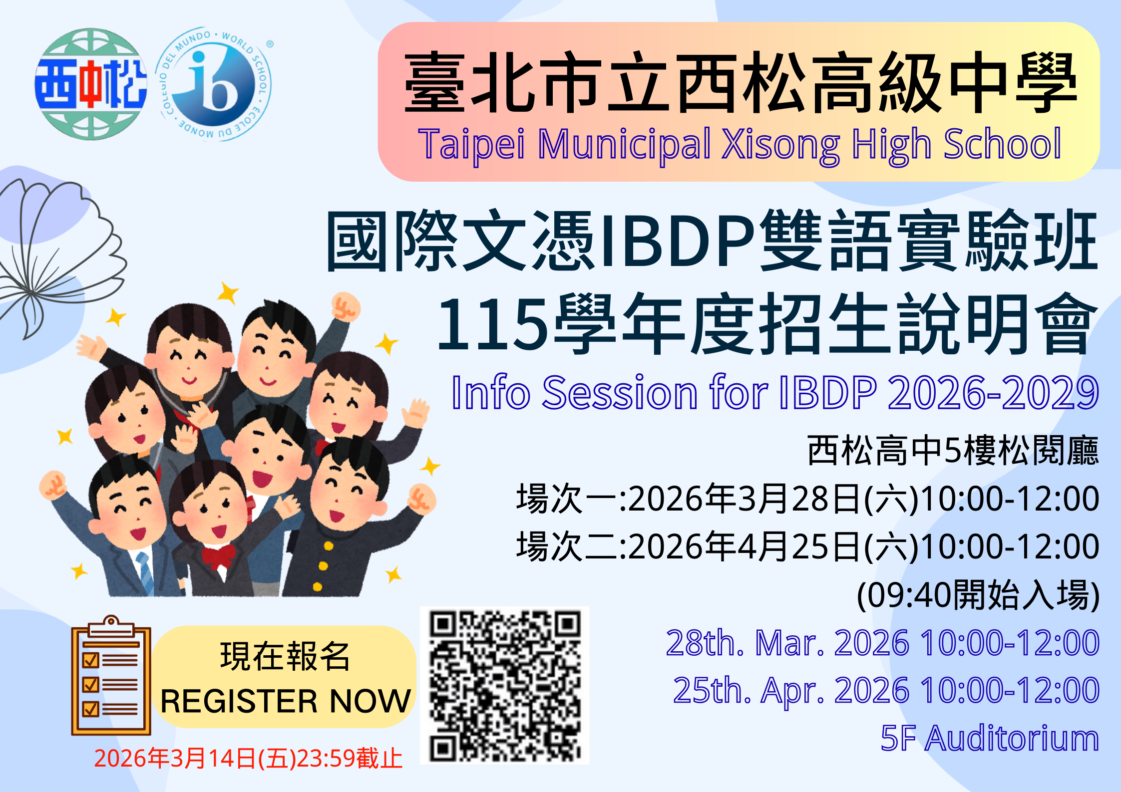 一、臺北市西松高級中學依特色招生計畫,115學年度預計招收 22位學生編入「國際文憑IBDP雙語實驗班」。為使對本校 IBDP國際文憑課程有興趣之學生、家長及教師瞭解課程理念、修課方式、招生管道及學生入學後輔導資訊等教育方 案,特辦理說明會供大眾參考。