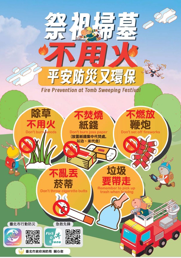 清明節將屆,為防止掃墓期間引發火災等公共安全意外事故,請加強清明掃墓期間墓地防火注意事項宣導:「除草不用火」、「不焚燒紙錢」、「不燃放鞭炮」、「不亂丟菸蒂」及「垃圾要帶走」。